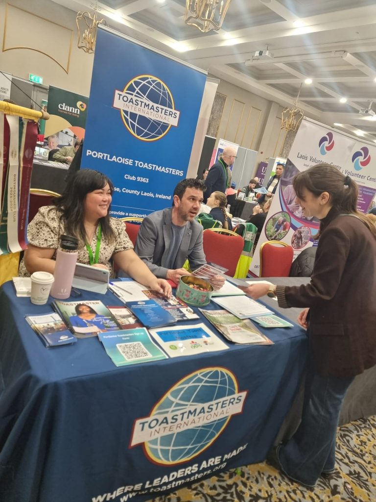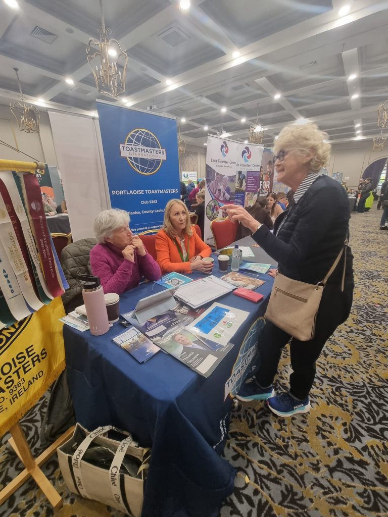Portlaoise Toastmasters Club took the global brand to the public on the 8th April with a stand at the Live Well Expo at the Portlaoise Park Hotel. Despite being allocated a position at the rear of the hall they connected with several hundred of the estimated three thousand who attended the exhibition. Thirty five members of the public signed up to get email information and three of them attended the next club meeting on 13th April and several more have emailed their intention to attend the club on the 27th April.